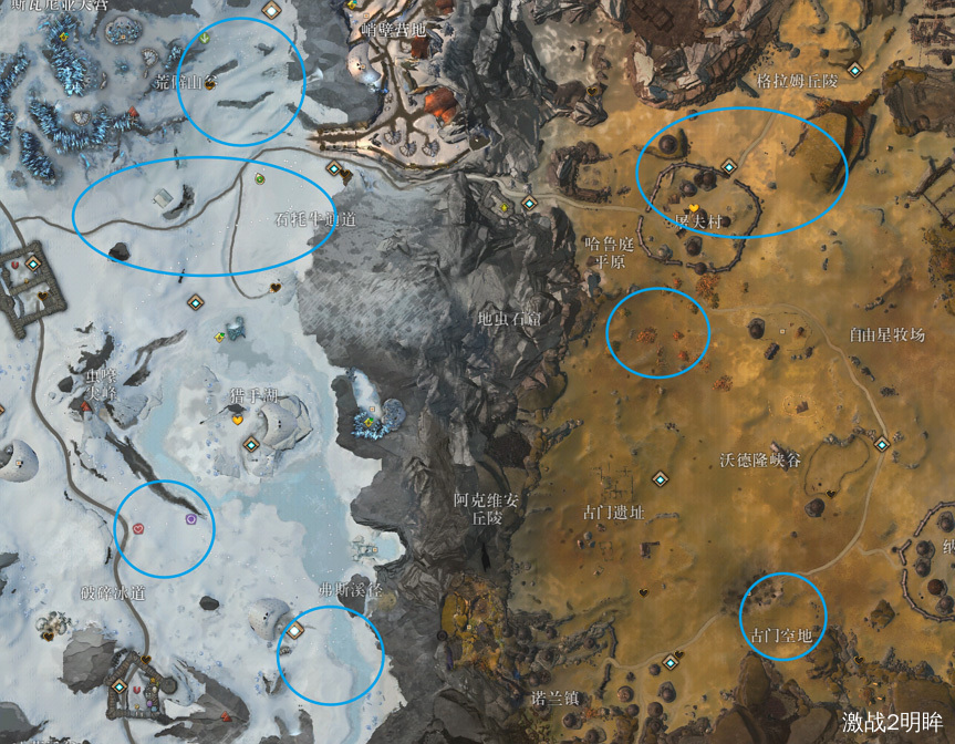 ①先去旅者丘陵和底耶沙高地拾取难民的物品,物品刷新位置不固定,每个图每天只刷新三个,对应三个物品,请在画圈位置附近寻找(圈只是大致范围,若圈内没找到,可适当扩大搜索范围)
