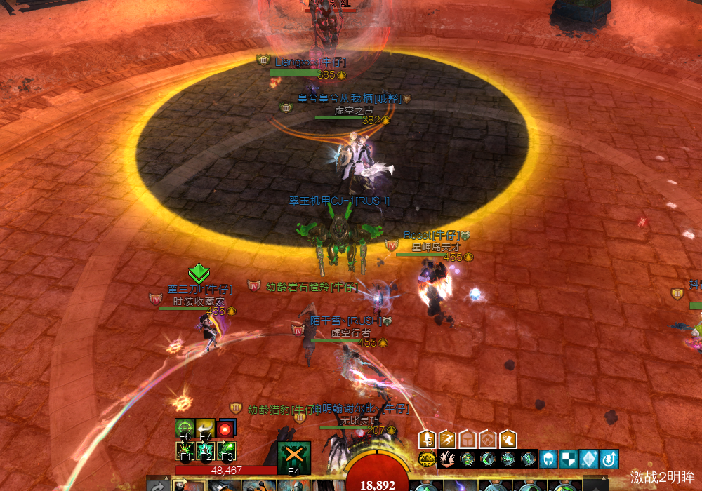 会同时刷新两个boss,开场主T接红色,副T接绿色,大团打红色,副T拉着绿色遛弯。红色死了之后,主T场地中间接蓝色仇恨,大团打绿色boss,主T只需要让蓝色boss不面向大团就行。绿色死了之后,大团打蓝色,副T中间接红色。