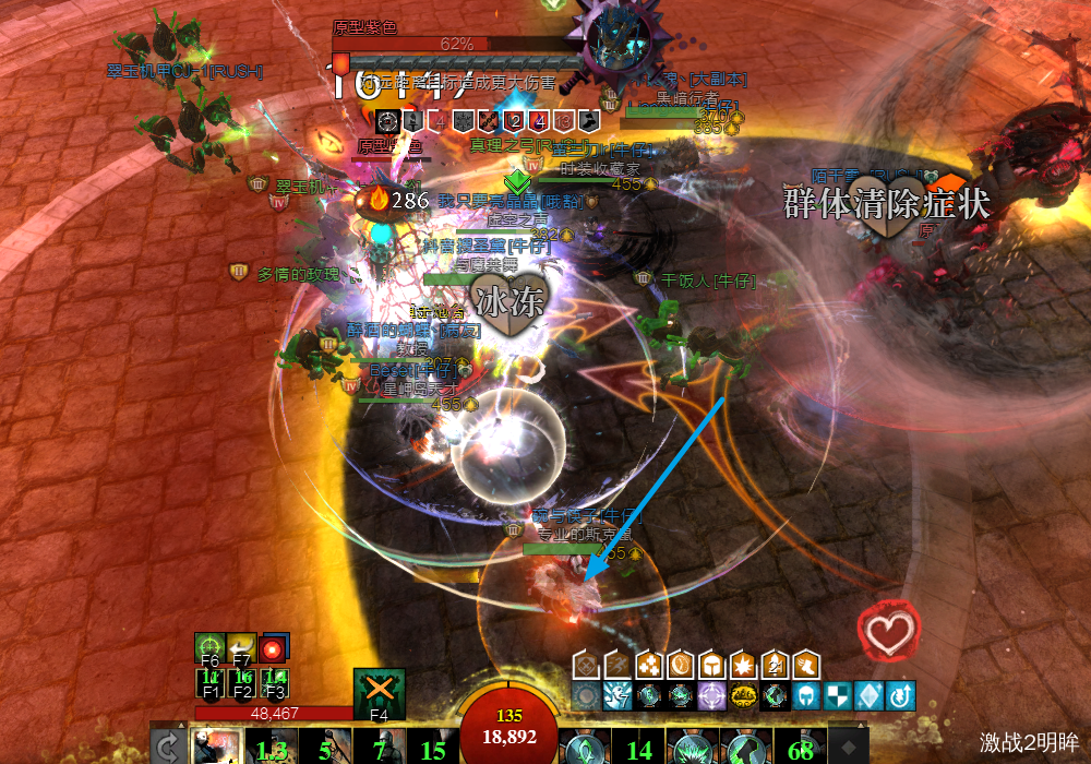 3个boss血量降低到10%时,我们需要破掉蓝色boss的蔑视,此时红色boss脚下会出现安全区域。
