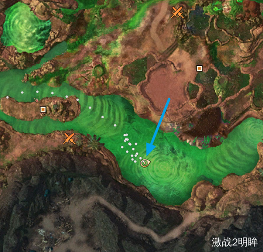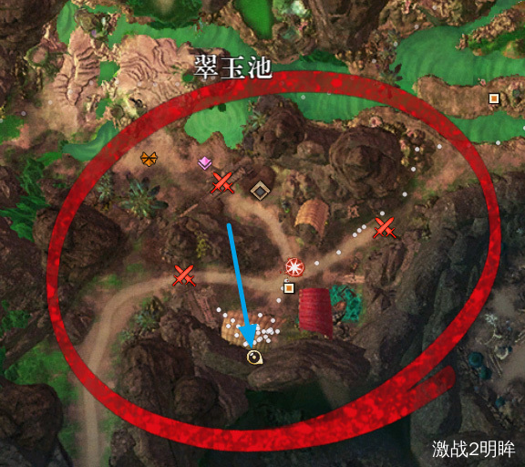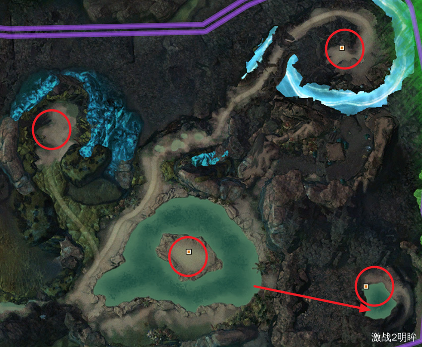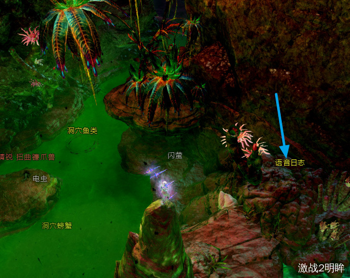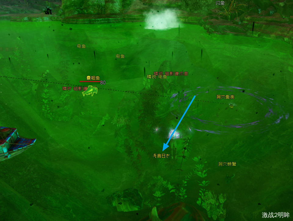 突破结束后,会刷新四个首领,箭头所指为水下通道,通道里有发光水草,类似于水域碎层,靠近发光草获得buff免疫伤害。
