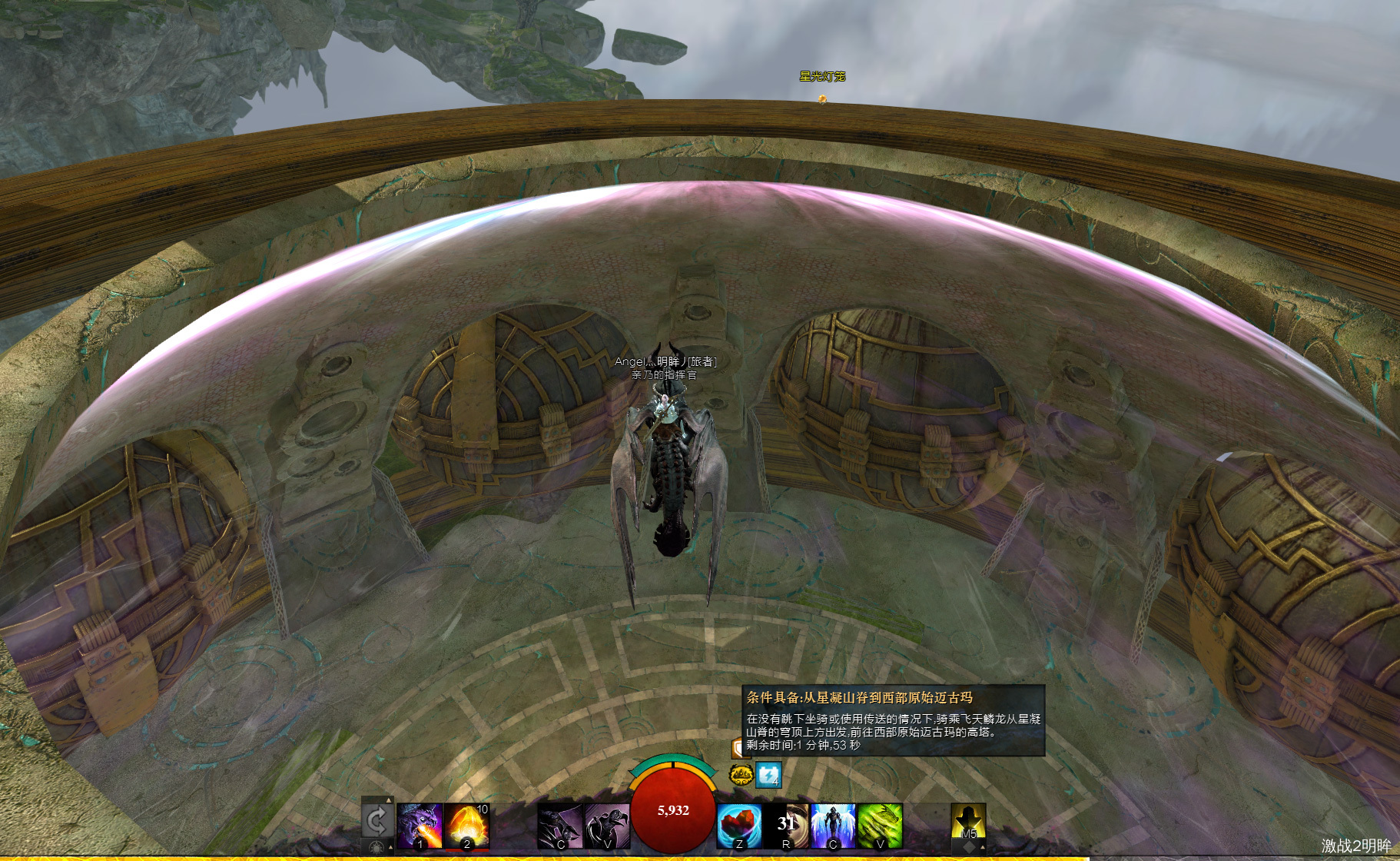 其上飞龙在天空哨站群岛=德格达的洞察=[&BPsNAAA=]玻璃罩上可以获得成就buff,然后一路飞到天空哨站群岛=格林特神殿=[&BAQOAAA=]风景点位置,中途不能下坐骑。